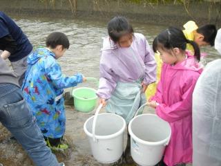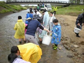 4/24 4年生:アユの放流 全校:はじめましての会