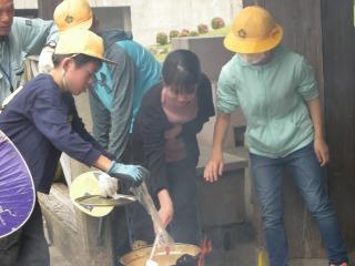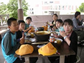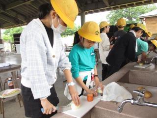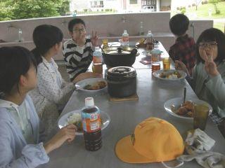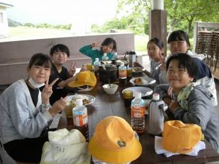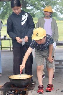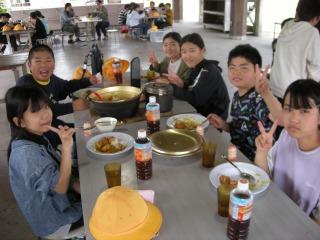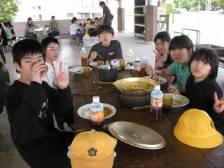 午前の活動は、野外炊飯です。カレーライスづくりに挑戦しました。各班でかまど係と調理係を分担し、取り組みました。かまど係はかまどの火の調整を所の方や先生にアドバイスしてもらい、苦労しながら調理のための火のお世話をしました。各班協力しながら上手にカレーを作れたようです。苦労して作った分、おいしくいただくことができました。