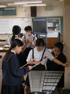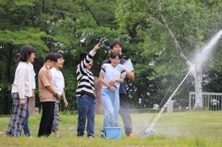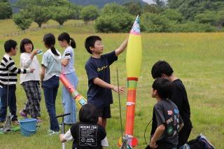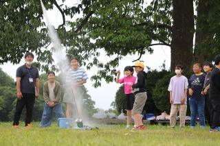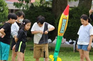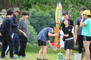 午後は水ロケット飛ばしです。発射台にセットした水ロケットに空気入れでたくさんの空気を入れ、発射させます。何回も飛ばすうちに、どの班も高く、遠く飛ばせるようになりました。ぬれることも気にせず、夢中になって飛ばしていました。