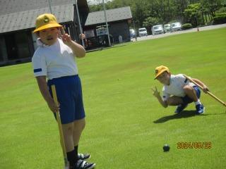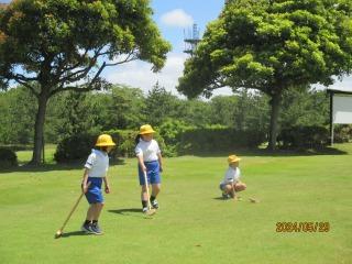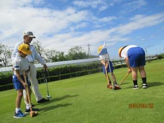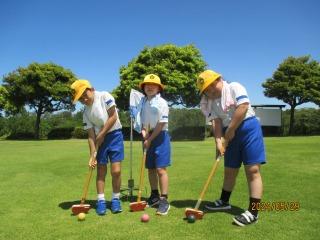 2年生が生活科の校区探検で二ツ屋地区に行きました。高松グラウンドゴルフ場では、実際にグラウンドゴルフの体験もさせていただき、楽しく校区探検できました。グラウンドゴルフ協会会長小川さん、親切にご指導いただき、ありがとうございました。