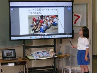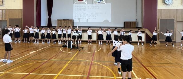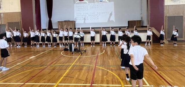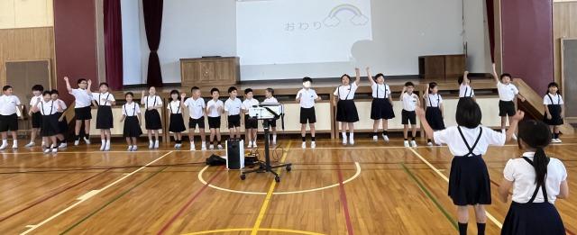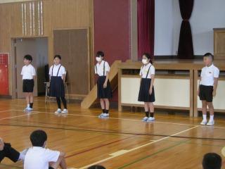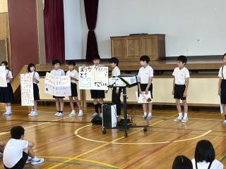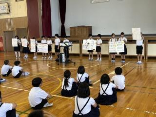 本日の昼、7月の全校集会を行いました。校歌、話し方大会の表彰、校長先生のお話、その後、6月生活目標の振り返りを各クラスの代表児童に発表してもらい、7月の生活目標「ふわふわ言葉を使おう」について5年生が発表しました。最後に6月の歌「にじ」を元気に歌って終わりました。