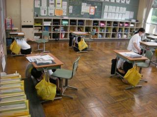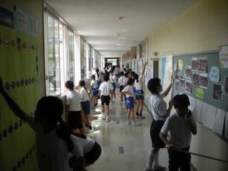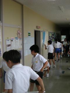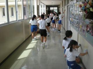 8月のPTA奉仕作業で2階職員室前廊下のペンキ塗りをする予定です。その事前準備として4~6年生の子どもたちが廊下壁面の拭き掃除を行ってくれました。職員室前廊下が9月にはきれいな壁に生まれ変わると思います。4~6年生の皆さん、ありがとうございました。