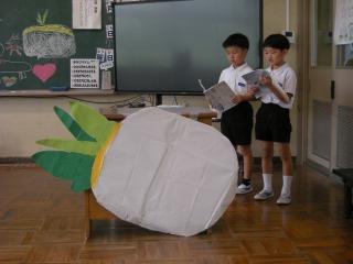 3限目に1年生が国語で学習した「大きなかぶ」の劇を2年生と先生方に見せてくれました。かわいらしいおじいさん達で協力して、見事、大きなかぶを抜くことができました。本HP動画チャンネル内で動画も見ることができます。
