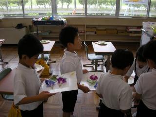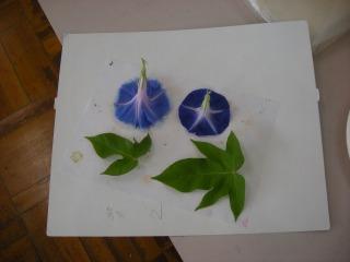 押し花の先生、葛葉さんに来ていただき、今、育てているアサガオの花を使って、押し花を