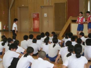 1限目に2.3.5年生の体育で着衣泳を体験しました。水泳や水遊びで水難事故になった時、救助までの間 、浮いて待つことが自分の命を守ることになります。今回、体験したことがいざという時に役立つと思います。夏休みは水に親しむ機会が多いと思いますが、子ども達には安全に十分気をつけて楽しんでもらいたいと思います。