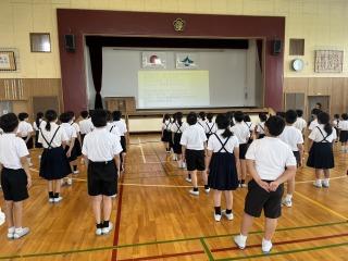 4限目に1学期の終業式を行いました。校歌を歌った後は、校長先生のお話、生活目標のふり返りの発表、夏休みの生活、プール利用のきまりについて話を聞き、最後は今月の歌「世界に1つだけの花」を全校のみんなで元気よく歌いました。