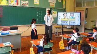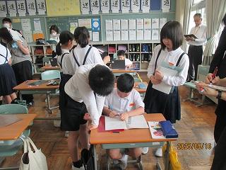 高松中学校のグレース先生にご指導いただき、1限目に外国語活動を楽しみました。今日の課題は「じこしょうかいをできるようになろう」でした。友達どうしで自分の名前を自己紹介し合うことができました。列ごとに自己紹介リレーを行う等、楽しみながら学べました。グレース先生ありがとうございました。