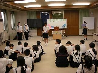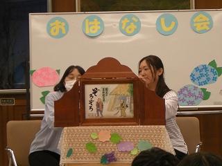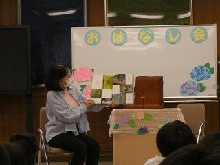 給食後の時間に読み聞かせボランティアグループ「ひみつのポッケ」さんが5,6年生に読み聞かせをしてくださいました。子どもたちは、絵本「さとやまさん」、紙芝居「ぞろぞろ」のお話を楽しみました。読み聞かせの後、子ども達はお土産にアジサイの折り紙をいただきました。