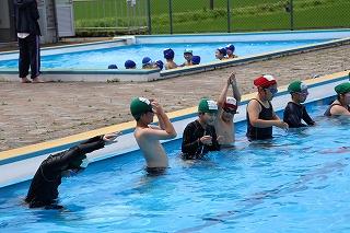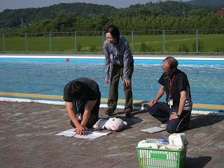 来週からの水泳学習スタートに当たり、万が一の事故に備えた職員研修を行いました。事故が起こったときに迅速な対応ができるよう、シミュレーション訓練を行いました