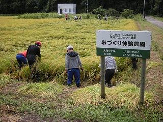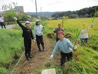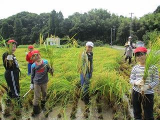 ☆5年生が3,4限目に稲刈り体験をしました。春の田植え体験から4か月が経ち、小さかった苗が立派な稲穂に育ちました。田んぼの先生東さんから刈り方を教えていただき、上手に稲を刈ることができました。とても貴重な体験になりました。地域・保護者の皆様にもお手伝いしていただきました。お世話してくださった皆さん、暑い中、本当にありがとうございました。
