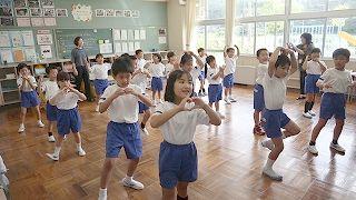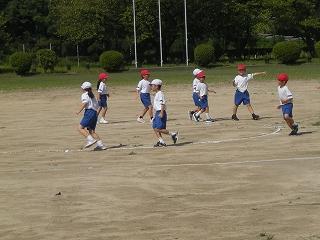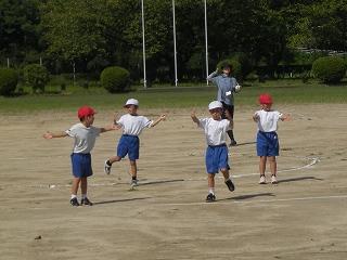今、1.2年生のお兄さん、お姉さんは運動会演技のダンス練習を頑張っています。振り付けや隊形移動を一生懸命覚えているところです。