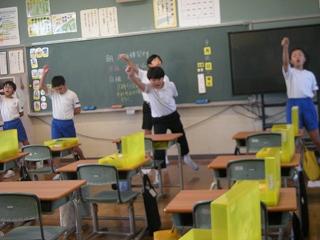 朝学習の時間に全校児童が赤組(プレイルーム)、白組(体育館)に分かれて練習しました。各組全員が集まっての練習は今日が初めてなので、高学年の応援係が一生懸命に自分の組の人たちに教えていました。これからの練習でもどちらの組も、本番のように頑張って練習してほしいと思います。