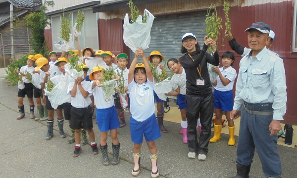 瀬戸町には3年生が味噌づくりのために5月に植えた大豆畑があります。