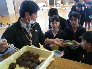 出来上がったおもち、来校者の皆さん、そして全校でおいしく頂きました!