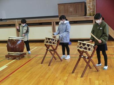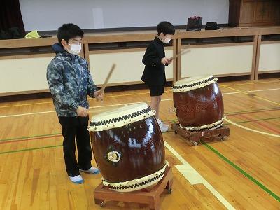本日3,4限目に、3年生が体育館で太鼓体験しました。音楽の授業として、和楽器に親しむことを目的に行いました。講師として、高松にお住いの岡田謙一さんと、岡田生大朗さんにご来校いただき、指導してもらいました。初めて太鼓を前にして、緊張している様子が伺えましたが、たたいているうちに緊張もほぐれ、楽しそうな様子に変わってきました。