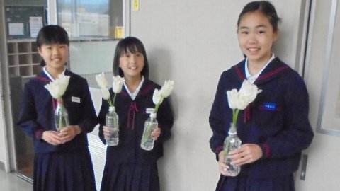 前庭にずっと最後まで白色のチューリップの花だけ咲き続けている話は以前しました。そろそろ時期も終わりなので切り花にしました。さわやか委員会の皆さんが全部の教室に、職員室にも配ってくれました。ありがとう。