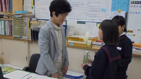 その中の笠川さんと髙﨑さんの手には、紙に包まれた切り花が。「持ってきたよ。」と自慢げに花を高々と上げて見せてくれました。本当にありがとうございます。各教室で呼びかけたら早速・・・うれしいかぎりです。学校中に広がるといいなぁ。