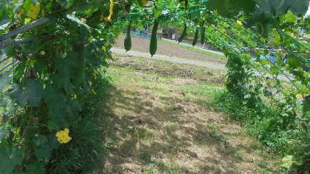 ヘチマの棚が緑の葉でおおわれ、あちらこちらからヘチマの実がぶら下がってきました。この調子なら一人一本もらえるかも・・・・楽しみですね。