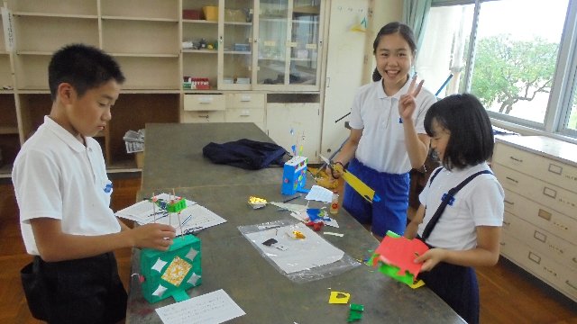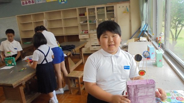 6年生が図工室で工作の作品を動かしていました。図工の時間が過ぎてもいろいろ工夫を続けていました。動きがおもしろいです。その動きをどんなものに合わせるか、工夫のしどころです。アイディアたくさんの図工作品が仕上がっています。