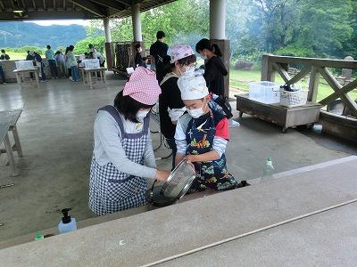 ☆午前の活動は、野外炊飯です。カレーライスづくりに挑戦しました。食器、調理、かまどの各係に分かれて、おいしいカレーができるようにがんばりました。家でもカレーを作ったことがある子もいるようで、手慣れた感じで調理する子もいました。かまどは、もう少し火をつけるのに苦戦するかと思いましたら、意外と上手に火をおこしていました。みんなで協力して作ったカレーの味は、思い出になったと思います。
