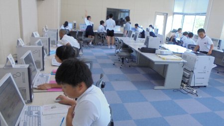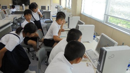 6年生がコンピュータを使った学習をしています。とても使うのが上手です。探している情報をいかにして見つけるか、そういった力を身に付けるようにしています。また、写真でもわかるように見つけた情報について個々が関わり合って話す。こういう所でコミュニケーションがまた生まれるのですね。