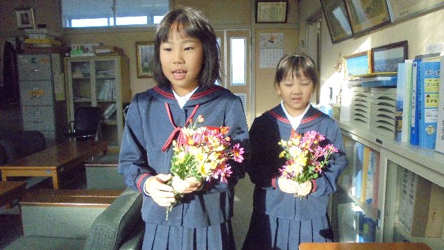 校長室に優しいノックの音が・・・家から持ってきた花のおすそ分け、ありがとうございます。菊の季節ですね。さっそく職員室前廊下に飾らせてもらいました。2年教室にも良い香りが漂っています。