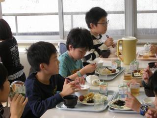 宿泊体験学習2日目。朝のつどい~掃除~朝食 規則正しいリズムで2日目の活動がスタートしました。