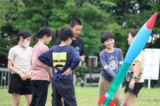 午後は水ロケット飛ばしです。発射台にセットした水ロケットに空気入れでたくさんの空気を入れ、発射させます。何回も飛ばすうちに、どの班も高く、遠く飛ばせるようになりました。ぬれることも気にせず、夢中になって飛ばしていました。