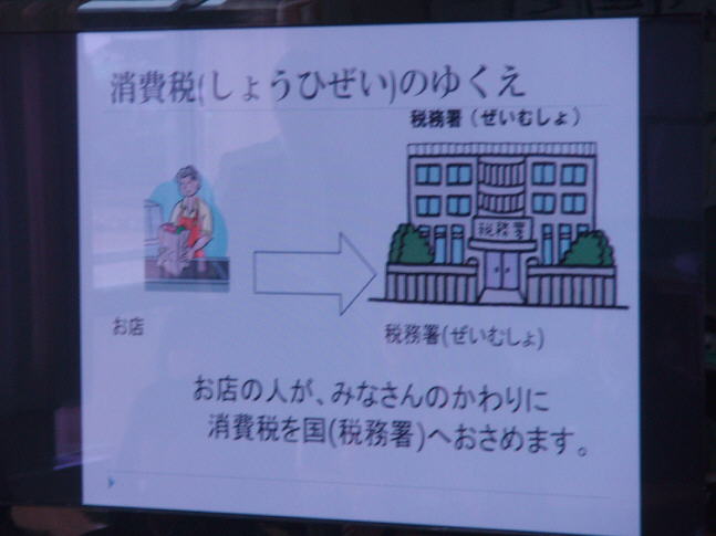 さて、5限目に「租税教室」がありました。税金の種類や納め方、その使われ方などを大型テレビやプリントを使って学習しました。児童への質問で、「みんなは、税金を納めてことがあるか。」の問いに対して、全員「いいえ。」でした。消費税で税金を納めているという感覚は児童には内容です。