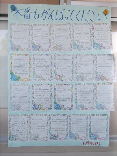 今日は、器械運動交歓会の日です。会場は今まで通り宇ノ気小学校の体育館で行いますが、今年からかほく市単独開催になりました。小学校6校の4年生全員が演技を公開します。その応援として、優しい6年生が4年生に掲示物を描いてくれました。「練習通りがんばってね」「遅くまで練習をして大変でしたね」などの内容が書かれています。大海小学校全員の期待に応えるように。そして、全員が金シール(一応演技が合格である)を取ってほしいと思います。