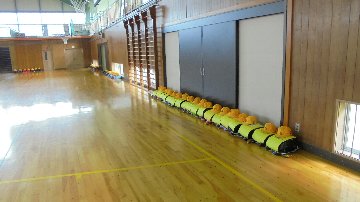 これは、先日集団下校のため体育館に集まったときのランドセルです。黄色のカバーをしてあるものは1年生の分です。上級生のお兄さんお姉さんがお世話してくれました。他の学年は各自が並べました。すごいですね、さっそく校長先生から褒められていました。これも大海っ子の伝統ですね。