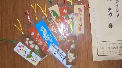 学校安全ボランティア隊のメンバーの葛葉さんから先日プレゼントをいただきました。プレゼントは「押し花のしおり」です。一枚一枚心を込めて作ってくださったものです。そして全校児童分、教職員の分も作ってくださいました。