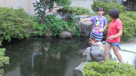今日は池のメダカにえさやりをしているところに合いました。春生まれたメダカがだいぶ大きくなっています。〔早生まれ)校内の理科室で生まれたメダカは、まだ1cmもありません。自然はすばらしいのですね。