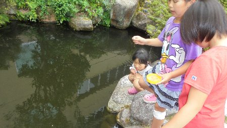うさぎと池のメダカにえさやりもしてくれます。楽しみながら、きちんとやってくれるところがすばらしいですね。あいさつもOK。