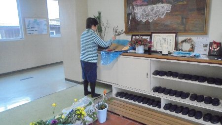 昨日はクリスマス、ご家庭ではケーキを囲んで楽しいひとときを過ごせたでしょうか。学校の玄関の花、クリスマスバージョンでしたが、さっそく細川さんが生け替えに来て下さいました。テーマはお正月、松竹梅やら水引やら豪華な飾り付けにしていただきました。お聞きすると長持ちして子どもたちが登校するときまで大丈夫だそうです。