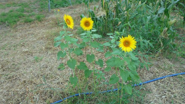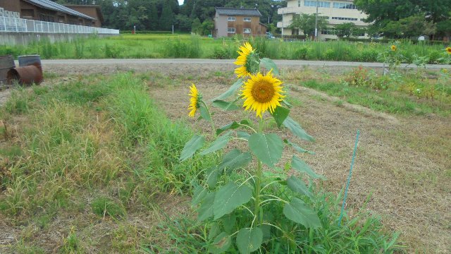 ひまわりが満開で見頃だとお知らせしましたが、こんなところにも咲いています。ぽつんぽつんと畑のいたるところに花を咲かせています。これは、ひまわり畑をみんなで作り終えてから「秘密の場所にうえてごらん」と渡された種を植えたものです。こんな場所に植えたのですね。
