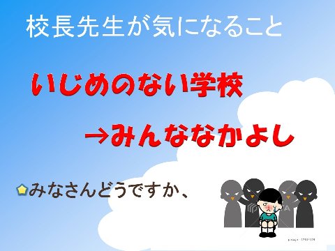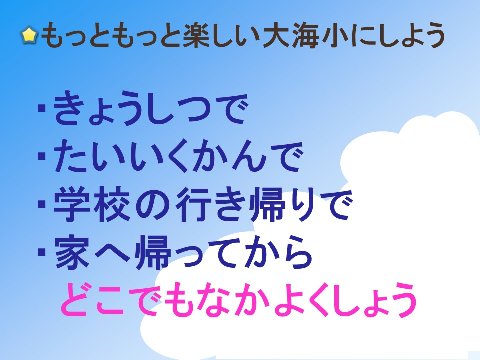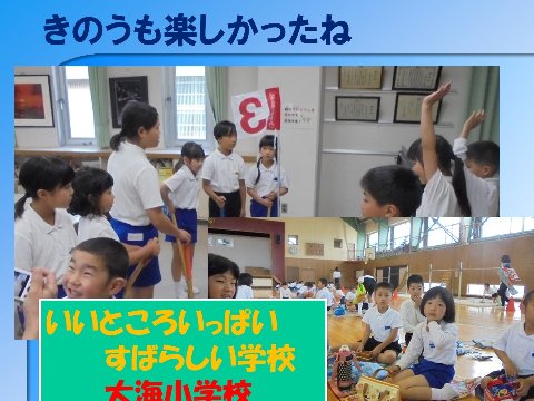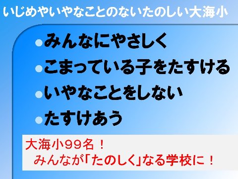 校長からは、「みんななかよし大海小」、もっと仲良くして楽しい学校生活を送りましょうと呼びかけがありました。集会で子どもたちに見せた画面をのせますね。どんな話だったか週末の話題にしてみて下さい。