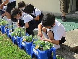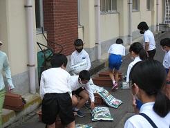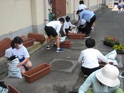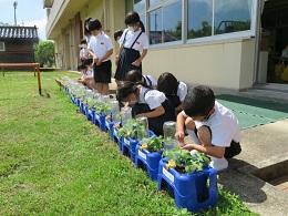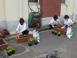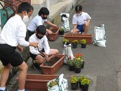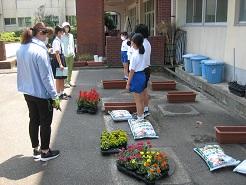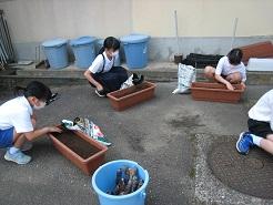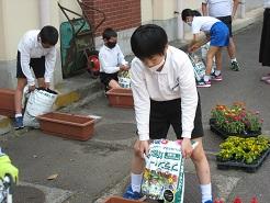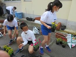 『人権の花』として、花の苗や腐葉土、プランターがたくさん届きました。今年は緑の少年団の活動として、14日(月)に5,6年生の団員で植えます。それに先立ち、さわやか委員会の子どもたちが、花の植え方を教えるための準備活動をしました。