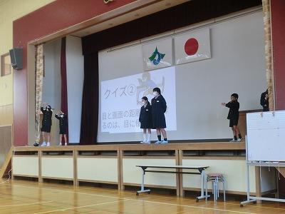 本日、今年度最後の授業参観でした。多くの保護者の方々に来校していただき、誠にありがとうございました。授業参観に続いて、学校保健委員会を体育館で行いました。今年度のテーマは「目いい探偵コナン~大切な目を守ろう~」で、近年、視力の低下が著しいため、目の健康について考える機会としました。健康委員会の劇の後、イプラスジム福井の宮谷伸一氏を講師としてお招きし、視力とビジョントレーニングについてお話していただきました。とても興味深い内容で、ぜひご家庭でも実践してほしいと思いました。その後、各学年ごとに学級懇談会、6年生は中学進学に向けて制服採寸を行いました。天候が心配されましたが、いい天気の中、最後の授業参観が行えてとてもよかったと思いました。