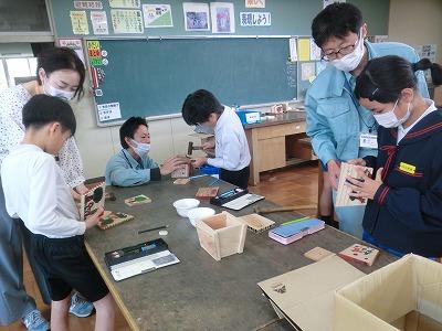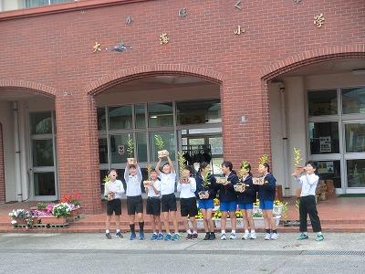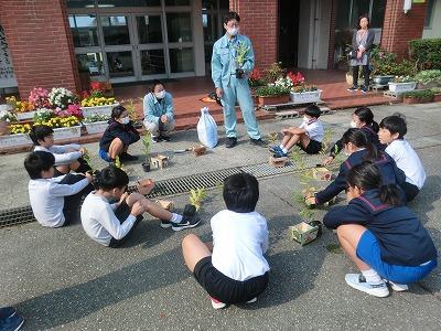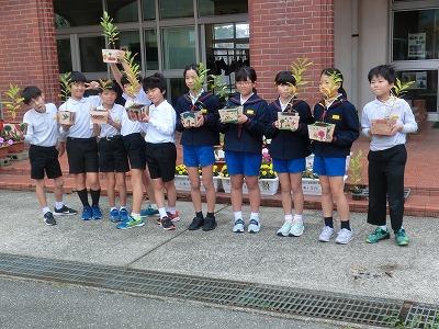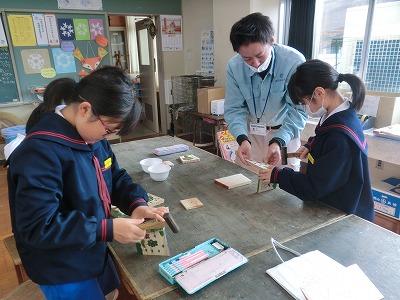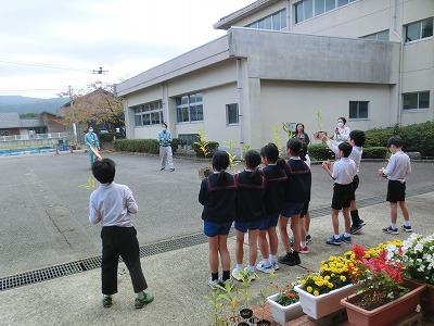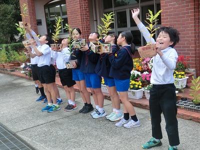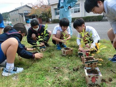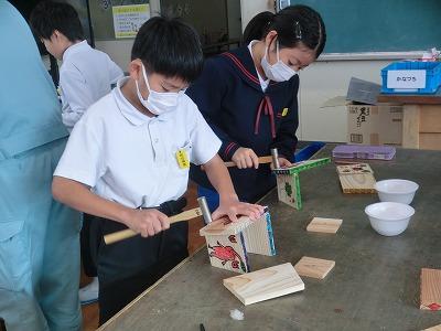 3,4限目に4年生が金沢森林組合の方々の指導の下、ミニプランター作りをしました。事前にプランターの表面に絵をかいて、それを組み合わせて釘を打ちました。釘が曲がらないように注意しながら打っている様子が印象的でした。出来上がったプランターにクヌギの苗木を植えて、来年の春に学校林に移植します。最後にドローンを使っての記念撮影で大盛り上がりしていました。