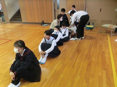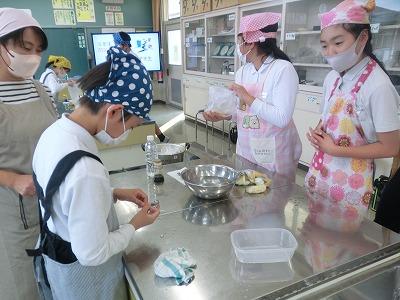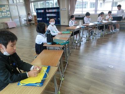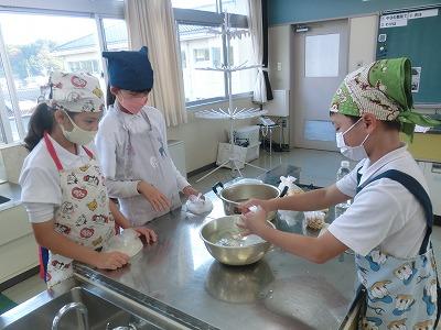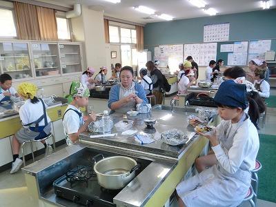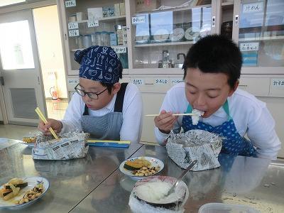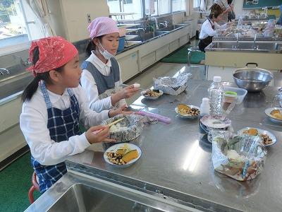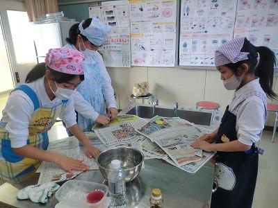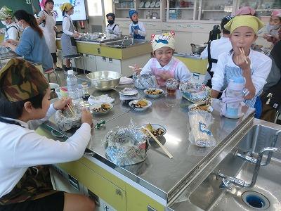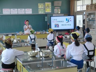 5年生は、5,6限目に県栄養士会の橋本先生から防災への心構えや簡単に作れる防災食、新聞紙で作る器の作り方などを教えていただきました。「簡単に作れる」とはいうものの、子どもたちにとっては初めての経験なので、保護者や先生方に手伝ってもらいながら作っていました。でも、予想以上においしくできて、食べているときは皆笑顔でした。
