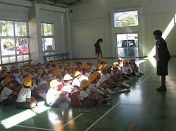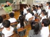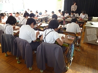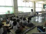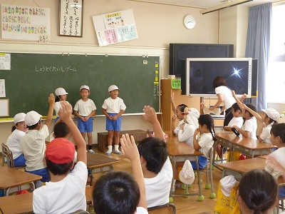 7月5日午前11時30分、県民一斉防災訓練が行われました。町内全小学校が参加しました。非常ベルが鳴ると、子どもたちは落ち着いて机の下に潜りしっかりと机の脚をつかむ訓練通りの避難ができました。