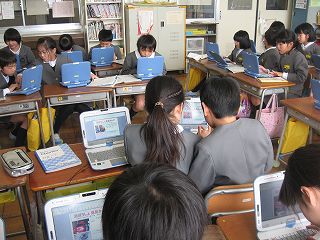 タブレットPCでデジタル教科書を開いて、セリフの発音を確認しているグループもいました。