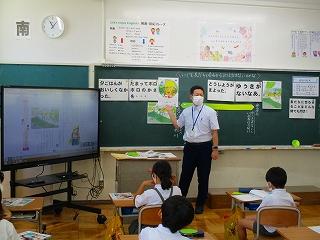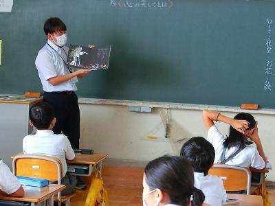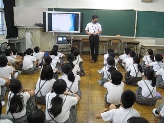 4日(金)に、内灘中学校から本出(もとで)先生に来ていただきました。6年生はあと半年ほどで中学校に進学します。今年度はコロナウイルス感染予防のため、これまで夏休みに行われていた中学校部活動体験も中止となりました。そのため、中学校での生徒の様子を感じる機会も今のところ、もてていません。