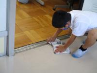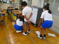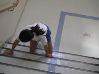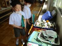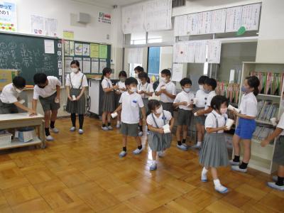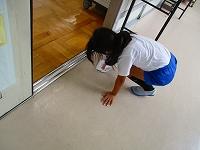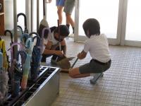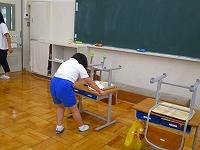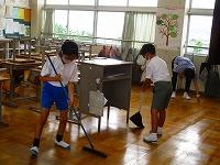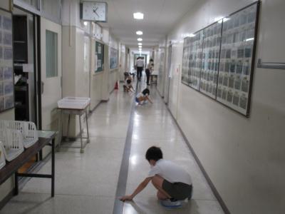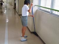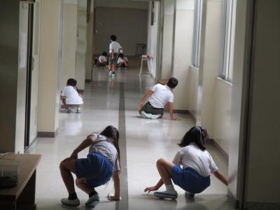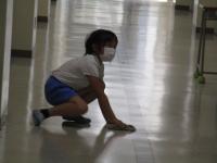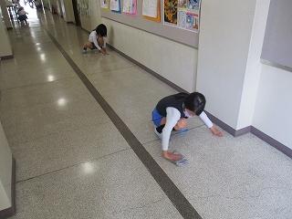 玄関前から1階廊下を掃除する2年生の姿がりっぱで、感心しています。掃除の仕方は、廊下の横幅を半分にして、半分ずつを2つ折りにした雑巾で横方向にふいていきます。雑巾がけと言えばお尻を上げて両手で雑巾を押さえ、ぐんぐん前に進んでいくふき方を思い浮かべるかもしれませんが、このふき方の方が何かにぶつかったり、前につんのめって顔から床にぶつかったりという危険性もありません。2年生は、1学期からお掃除が上手と、学校に来られるお客様からも褒められています。