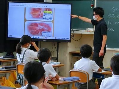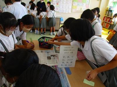 英語の時間に、6年生と4年生の交流がありました。6年生が開く食べ物のお店に4年生が来店。6年生が英語でメニューの紹介をし、4年生はお客さんとなって、互いに英語でやりとりし買い物をするという内容でした。