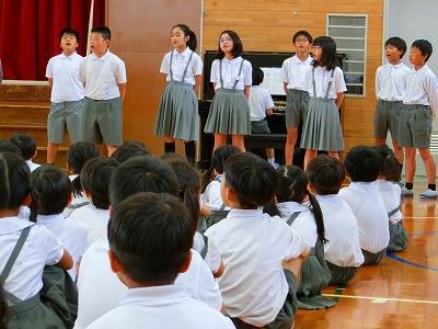 今日は、「授業で話を聞くときのポイント」について、6年生の国語の授業を例に話しました。ポイント①は、自分と同じ考えか違う考えかしっかり聞く ポイント②は、相手の意見が自分と違っても一度受け入れなるほど、なっとくと思うことを自分の考えに取り入れる ということです。なるほど、納得と思ったら、そのことを友達に伝えることも互いに学び合う上で大切なことです。「思いやりをもって協働できる子」が増えるほど、関わりの中で全体として子供たちは育ちます。1・2年生にはちょっぴり難しい話でしたが、3年生以上がしっかり聞いているので、小さい子なりに理解していたと感じています。