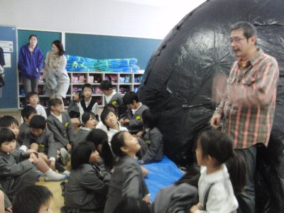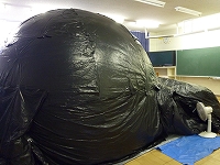 機材を運ぶお手伝いをして分かったのですが、材料はすべて身の回りのものです。たとえば、投影機は、金属製のボールに星座の位置に穴をあけたものです。写真のように膨らませるのは、扇風機です。