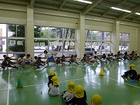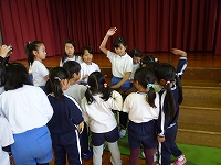 3年2組は、大根布保育園との交流です。まず、よさこいソーランを披露して、次は年長さんに伝授しいっしょに踊ります。