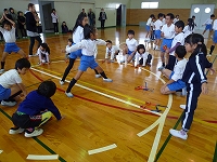 3年3組は、白帆台保育園と交流です。よさこいソーランの教え方が運動会の時の先生の口調とそっくりです。短い時間に上手に教えていました。最後に長縄8の字跳びや楽器体験をしていたのですが、3年生のりっぱな先輩ぶりが光っていました。